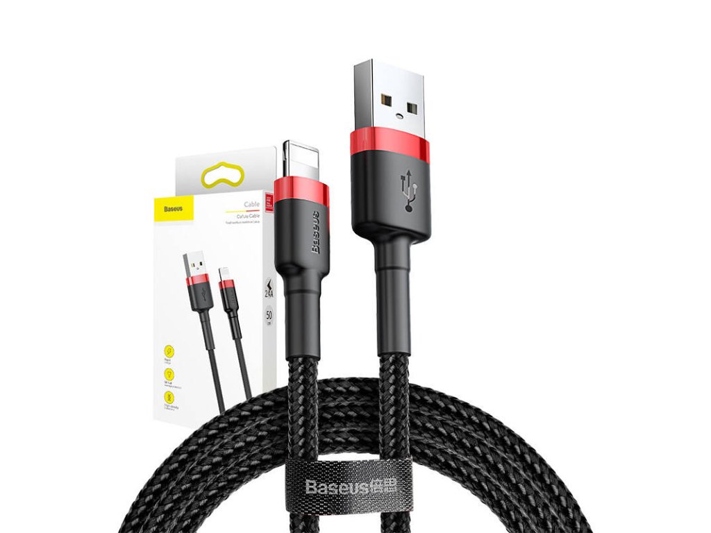 Kabel Baseus má délku 50 cm a maximální výstupní proud 2,4 A. Kabel poskytuje pohodlné používání a vysokou funkčnost. Byl vyroben z vysoce kvalitních materiálů, které zaručují dlouhou životnost výrobku. Byl vyroben z nylonového materiálu, takže se nezamotává. Kabel umožňuje nabíjení a přenos souborů mezi zařízeními vybavenými vstupem USB a zařízeními Apple vybavenými vstupem Lightning. Hliníkové koncovky, opletený kabel a zesílený gumový spoj zajišťují dlouhou životnost.