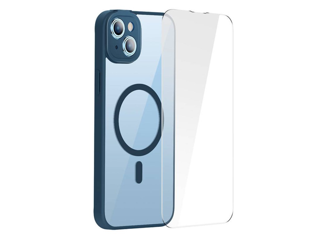 Sada ochranného magnetického pouzdra a tvrzeného skla Baseus Frame pro iPhone 14 Plus (modrá)