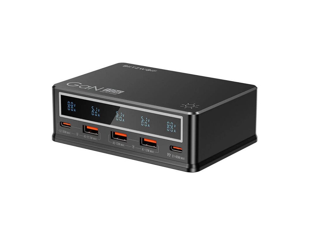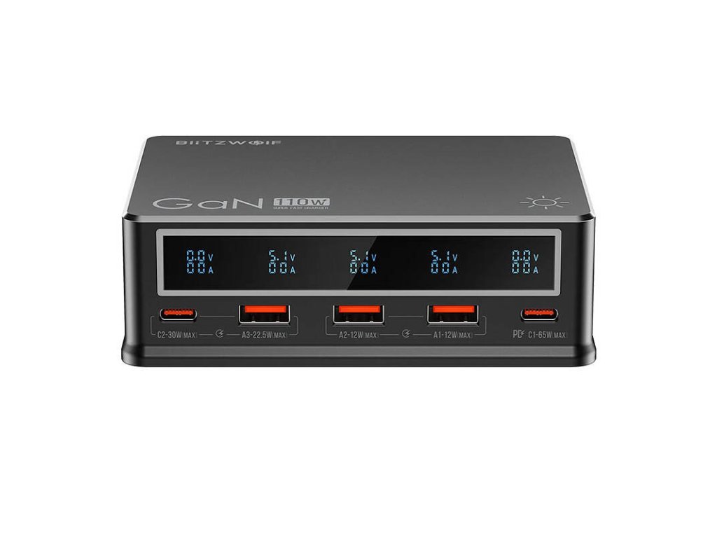 Jednou z nejpůsobivějších vlastností nabíječky Blitzwolf BW-i9 je její schopnost napájet až pět zařízení současně, díky čemuž je mimořádně všestranná. Tato nabíječka je vybavena třemi porty USB-A a dvěma porty USB-C, takže dokáže přizpůsobit svůj nabíjecí výkon specifickým potřebám každého připojeného zařízení. S maximálním výkonem 110 W poskytuje rychlé nabíjení pro všechna vaše zařízení, od smartphonů a tabletů až po notebooky a další elektroniku, takže je ideální pro ty, kteří potřebují účinný a rychlý zdroj energie.