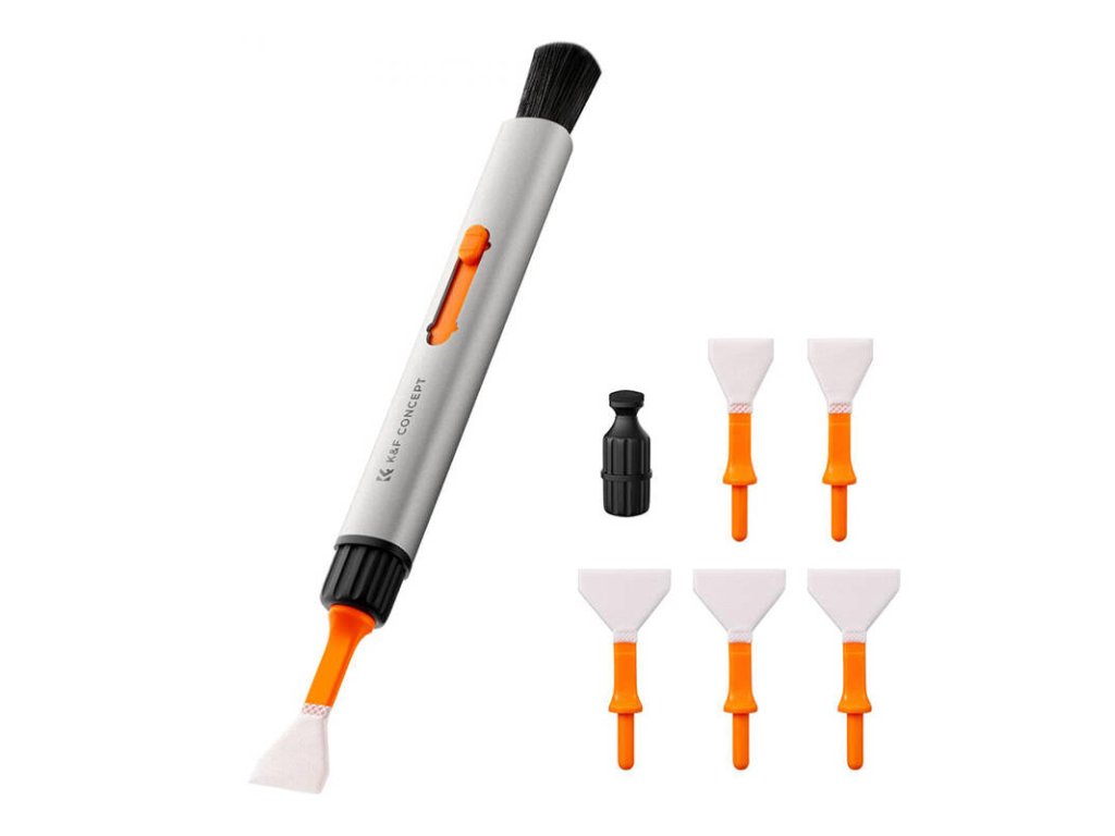 Čisticí pero K&F Concept SKU.1900 s vyměnitelným příslušenstvím je komplexní sada pro péči o fotografické vybavení. Mimo jiné obsahuje dva karbonové hroty a šest 24 mm širokých tyčinek pro čištění full-frame snímačů.