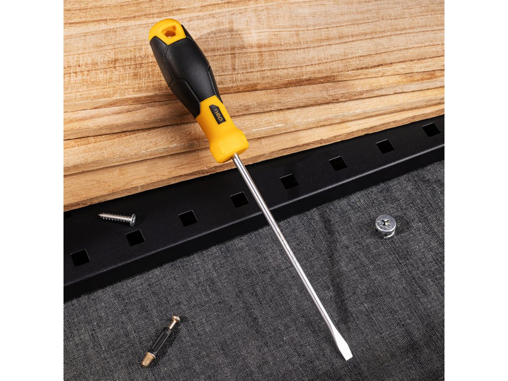 Praktický a robustní plochý šroubovák v černé barvě. Rukojeť výrobku je vyrobena z vysoce kvalitního plastu. Je vybaven praktickým otvorem, který umožňuje zavěšení například na nástěnku. Šroubovák skvěle padne do ruky a jeho používání je mimořádně pohodlné.