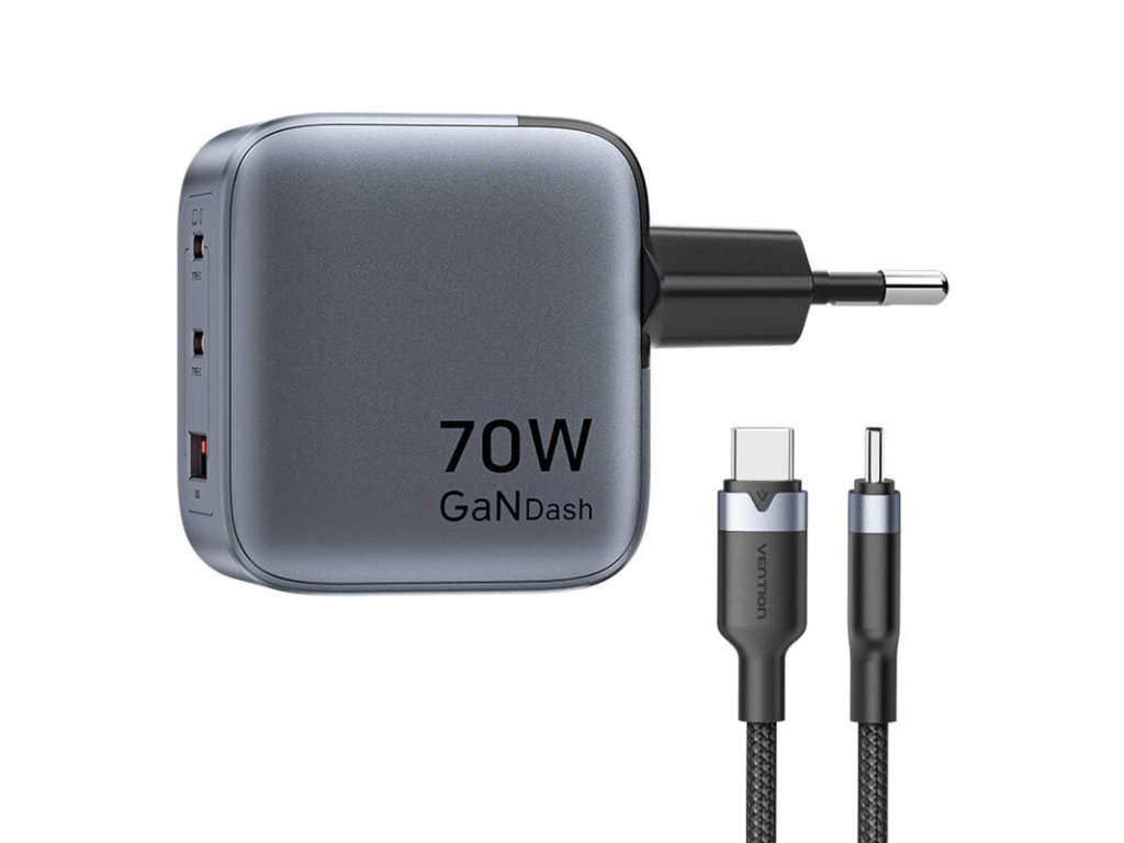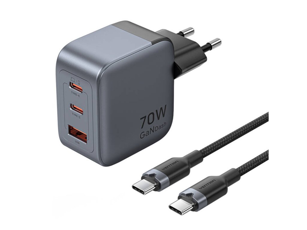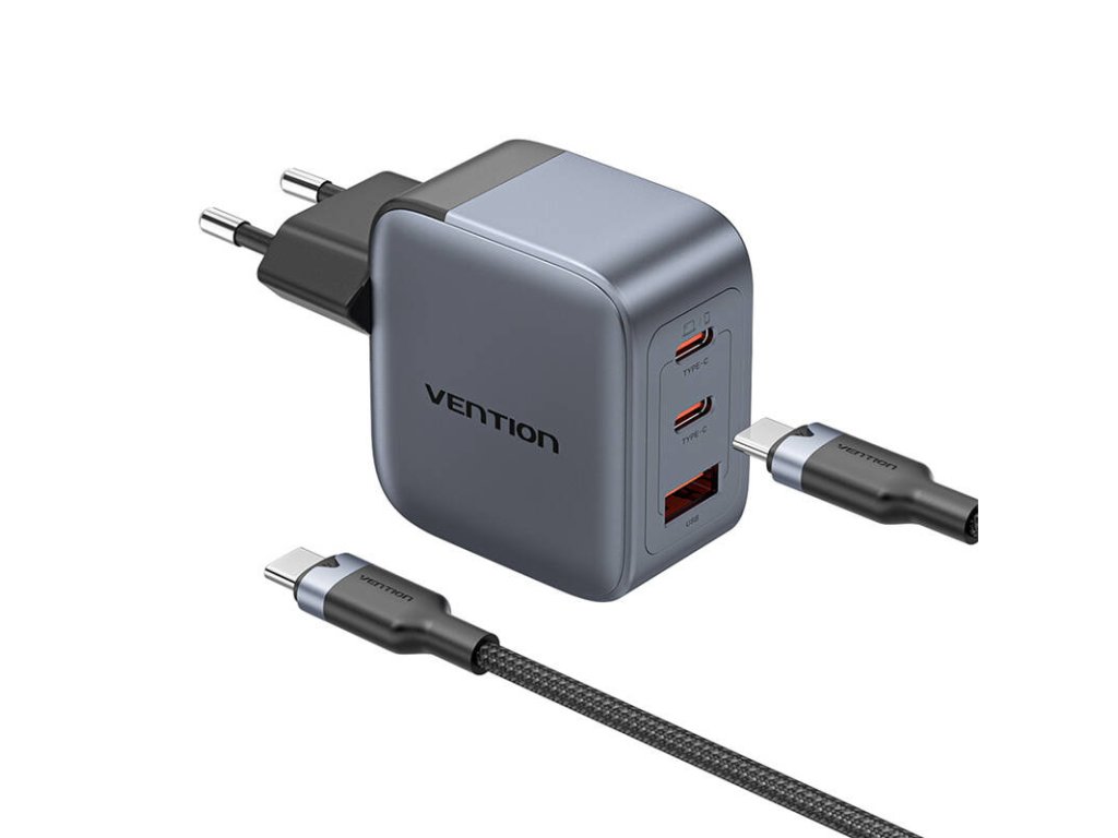 GaN Vention USB-C+C+A 70W nabíječka + kabel USB-C-C 1 m (šedý).