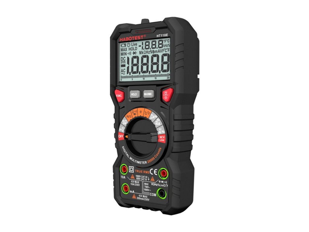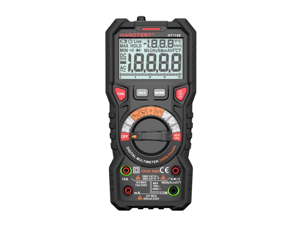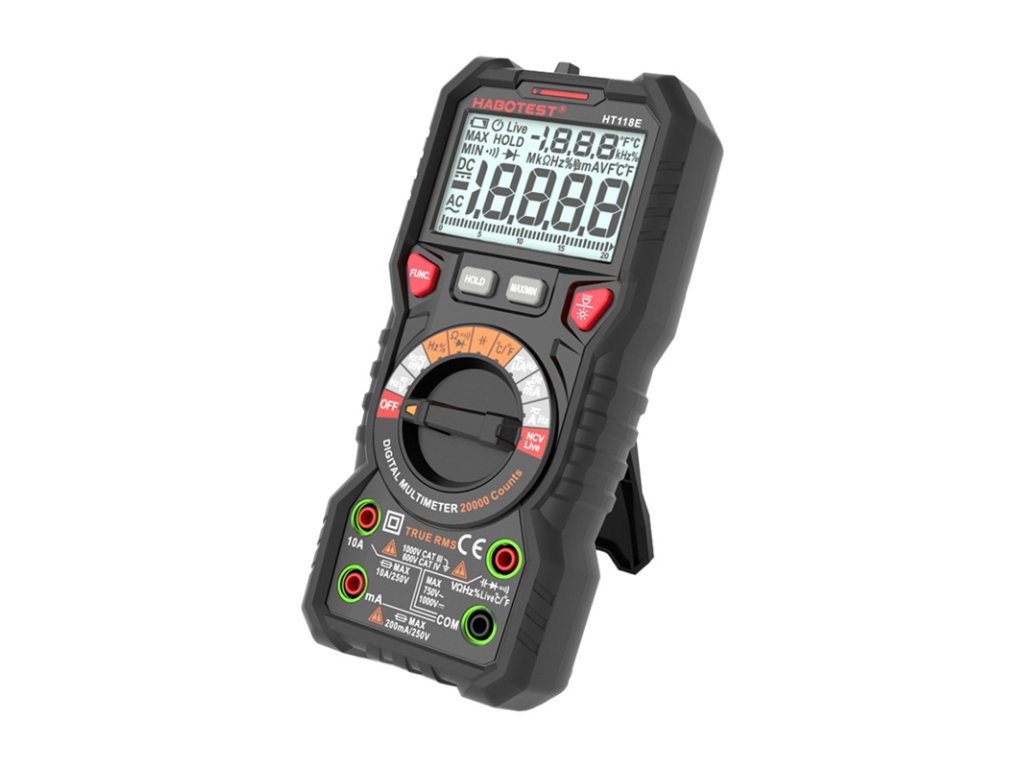 Habotest HT118E je univerzální digitální multimetr, který podporuje až 20 000 počítání a nabízí přesné měření střídavého/stejnosměrného napětí, proudu, odporu, kapacity, frekvence a teploty (-20 °C až 1000 °C). Funkce True RMS zajišťuje přesné odečty a bezkontaktní detekce napětí (NCV) zvyšuje bezpečnost provozu. Velký podsvícený LCD displej, LED svítilna, automatická volba rozsahu a vestavěný stojan poskytují pohodlí za všech podmínek.