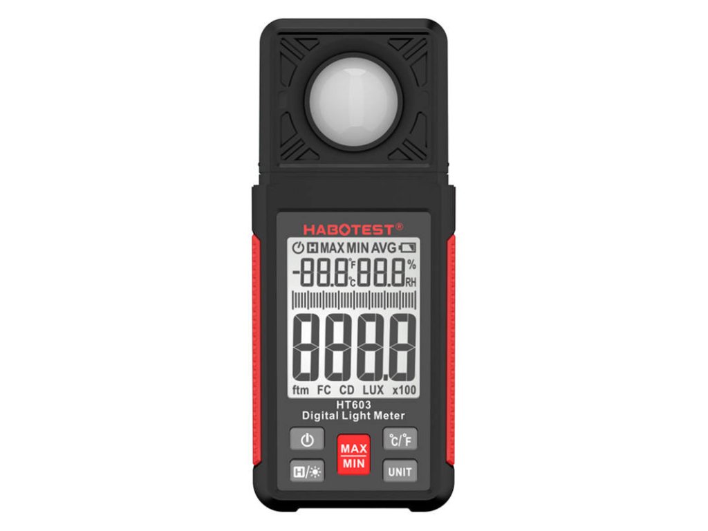 Habotest HT603 slouží k měření intenzity světla v rozsahu 0~100000 LUX / 0~10000 FC. Osvědčuje se v oborech, jako je elektrotechnický průmysl nebo pro účely kontroly místností. Vyznačuje se rychlou odezvou a díky otočné sondě je jeho používání pohodlnější. Kromě toho můžete přístroj použít také k měření úrovně vlhkosti a okolní teploty. Kromě toho je HT603 napájen 3 bateriemi AAA.
