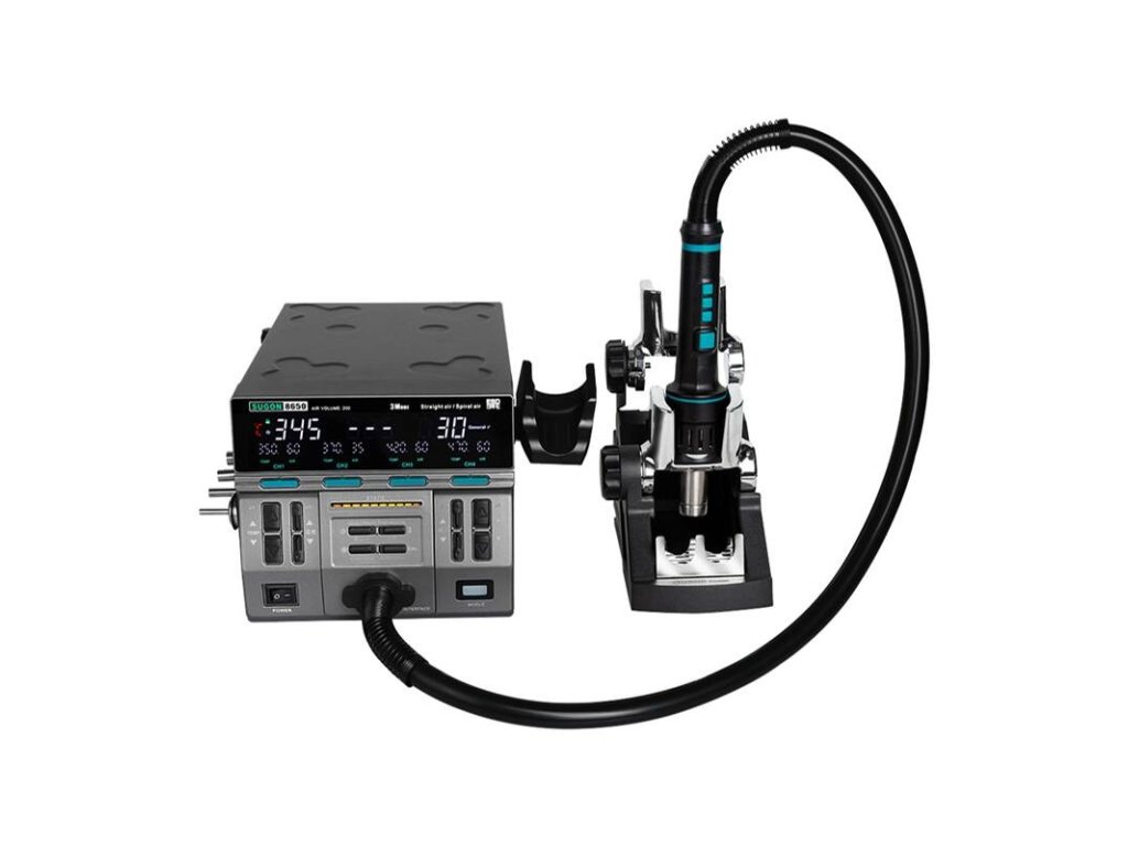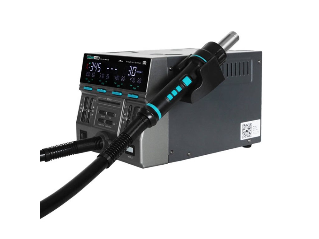 SUGON 8650 zaručuje stabilní a silný výkon díky transformátoru z čisté mědi, který poskytuje stabilní výkon 1300 W. Použitý bezkartáčový rotorový ventilátor se vyznačuje vysokou odolností, tichým provozem a vysokým průtokem vzduchu, což se projevuje ve snadném používání a efektivitě pájecí stanice.