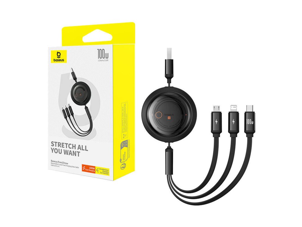 kabel 3 v 1 Baseus Free2Draw USB na M+L+C 100 W, 1,1 m (černý).