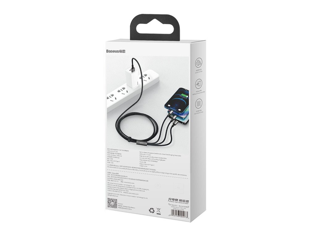 S kabelem Baseus CAMLTWJ-01 nabijete svůj telefon během okamžiku. Výrobek podporuje maximální proud 3,5 A a proud jednoho konektoru činí 2 A. To znamená, že vaše zařízení bude v mžiku opět připraveno k použití. Kabel také umožňuje nabíjení s výkonem až 66 W.