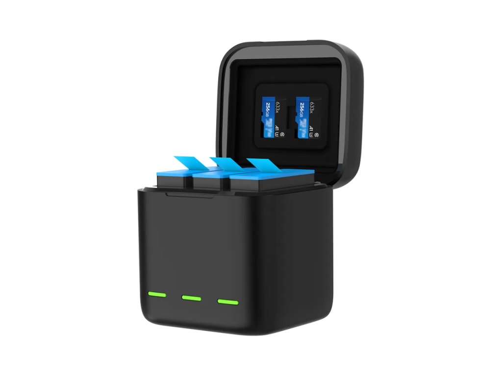 Nabíječka Telesin 3 v 1 umožňuje rychle nabíjet až 3 baterie GoPro Hero současně. Je lehká a kompaktní - můžete ji mít vždy po ruce. Díky komplexnímu bezpečnostnímu systému je její používání bez rizika. Vestavěné LED indikátory navíc poskytují informace o stavu nabíjení v reálném čase. Další výhodou nabíječky je silikonová přihrádka, do které můžete uložit až 2 paměťové karty TF.