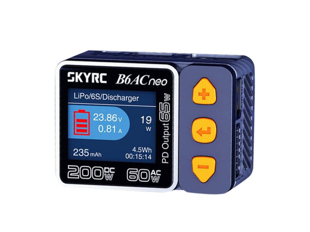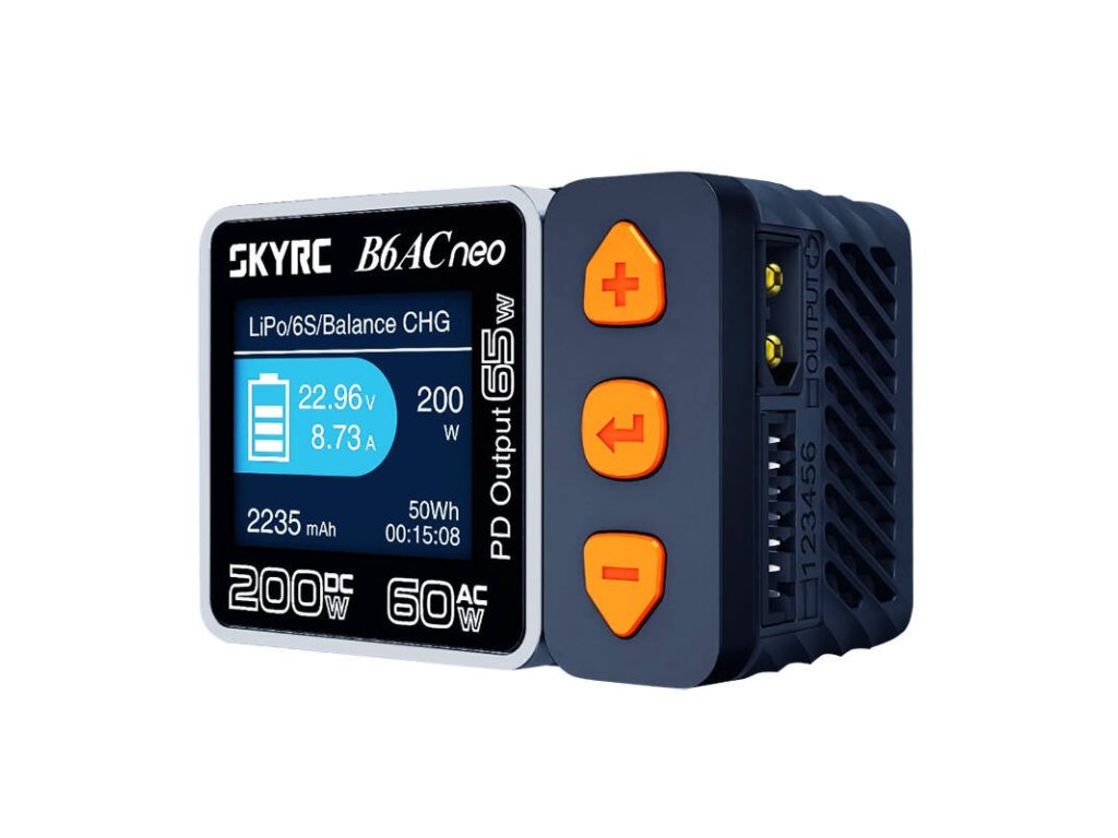 Nabíječka SkyRC B6AC Neo vás překvapí svými obrovskými možnostmi. Dokáže nabíjet baterie až do výkonu 200 W (stejnosměrný proud) nebo 60 W (střídavý proud), stejně jako vybíjet a sledovat jejich stav. Může se pochlubit působivým výkonem a tichým provozem a díky technologii GaN je mimořádně kompaktní, což usnadňuje její přepravu. Zařízení je vhodné i pro použití jako běžná nabíječka chytrých telefonů nebo notebooků a poskytuje až 65W výkon