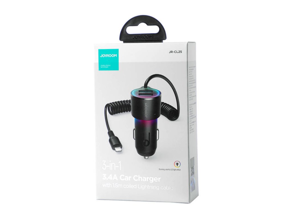 Nabíječka do auta Joyroom JR-CL25 je nezbytným příslušenstvím každého řidiče! Je vybavena 2 porty USB-A a kabelem Lightning, takže vy i váš spolujezdec můžete snadno nabíjet svůj smartphone současně. Vyznačuje se širokou kompatibilitou a je vhodná pro většinu vozidel, která mají zásuvku zapalovače cigaret. Stabilně drží v zásuvce a poskytuje komplexní ochranu před poškozením.