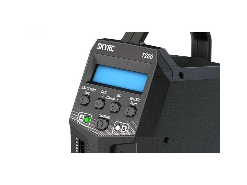 Nabíječka SkyRC T200 má nejkompaktnější konstrukci, zabírá minimum místa, odškrtává dvojici baterií. Nabíječka dodává 100 W integrovaného výkonu přes každý nabíjecí okruh. Za vkusným krytem se skrývá dostatek výkonu pro nabíjení dvou baterií současně s proudem až 12 A na kanál, takže během okamžiku napumpujete život do široké škály baterií, od přijímačových sad po 6S lithiumpolymerové nebo NiMH a NiCD 15S baterie. Nabíječ navíc poskytuje všechny možnosti programování, které od moderního špičkového nabíječe očekáváte.