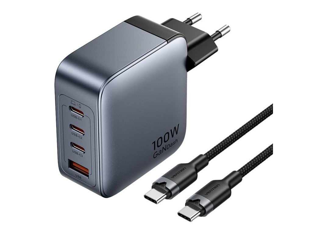 Nabíječka Vention 3x USB-C, 1x USB-A, (100W/100W/30W/30W/30W/30W) (šedá) s kabelem USB-C na USB-C (1m) (černá)