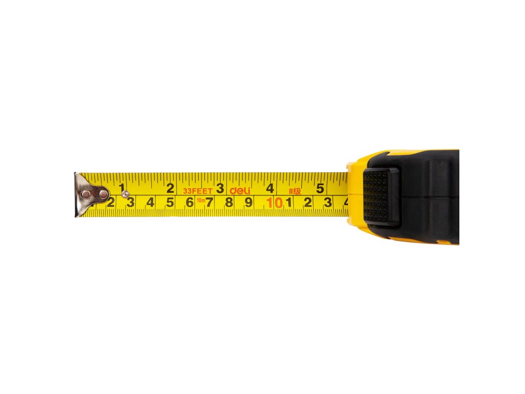 Desetimetrová svinovací míra Deli je vhodná pro domácí i profesionální použití. Můžete s ním snadno měřit například stěny nebo podlahy. Díky automatickému uzamčení můžete bez problémů pracovat samostatně. Měřidlo je vyrobeno z vysoce kvalitních materiálů a jeho používání je mimořádně pohodlné.