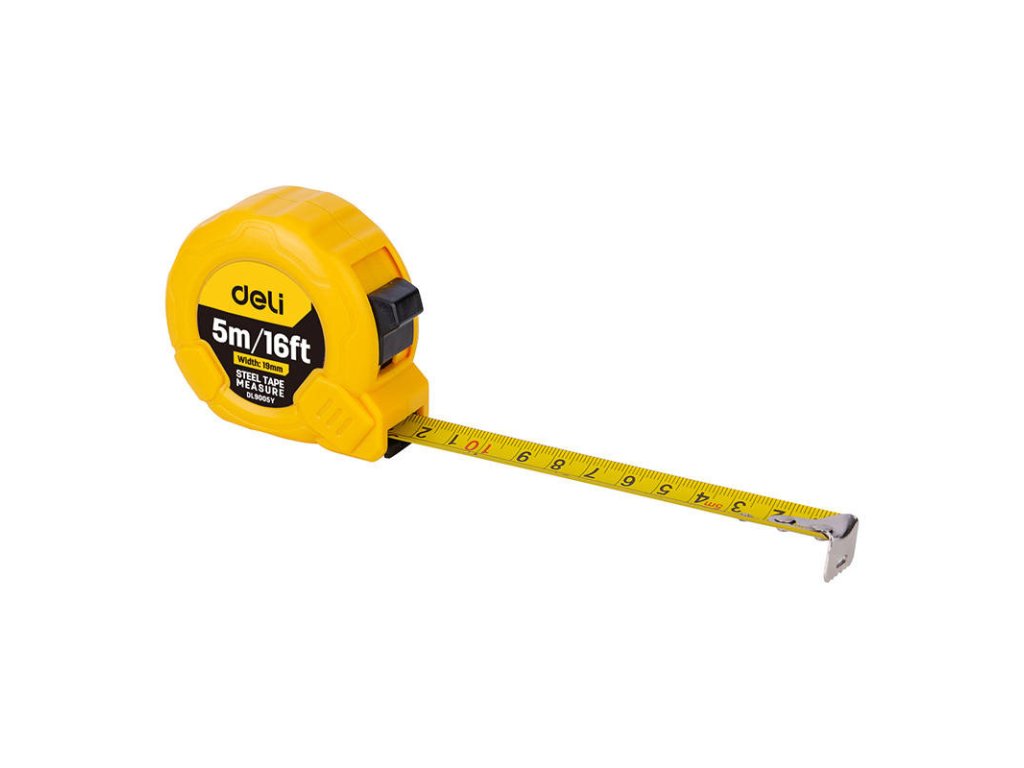 Měřicí pás je vyroben z pevného materiálu, takže se nezamotává a zůstává rovný. Díky tomu je nepostradatelný na rovných a rovných plochách na staveništi. Výrobek Deli je vybaven ergonomickým pouzdrem, které je odolné proti nárazům. Páska má speciální měřicí svorku pro přesné vnitřní a vnější měření.