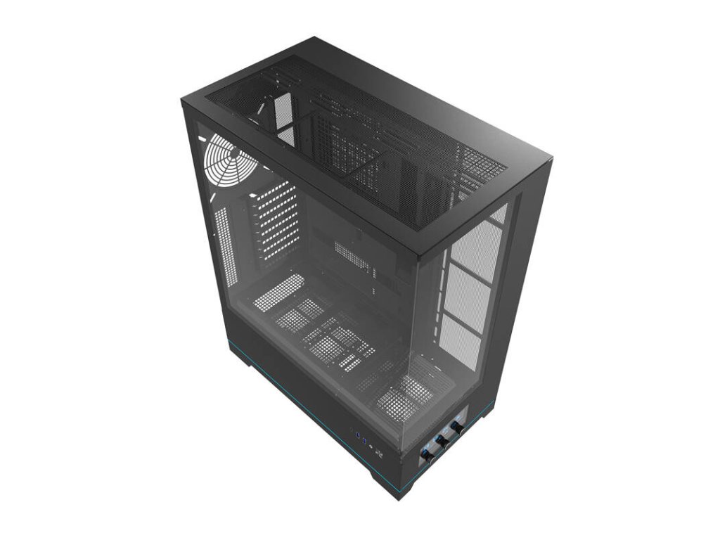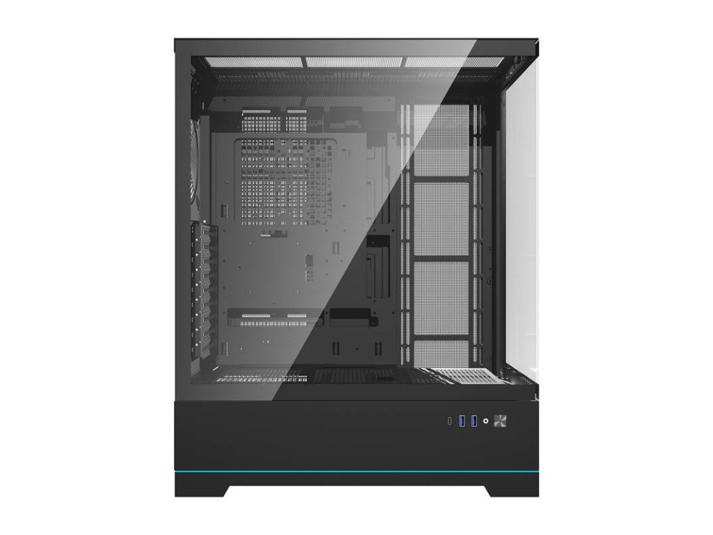 Skříň Darkflash DY451L je vyrobena z ocelového plechu o tloušťce 0,8 mm, což zajišťuje robustní konstrukci. Boční panel z tvrzeného skla umožňuje obdivovat vnitřek počítače a podtrhuje estetiku podsvícených komponent.