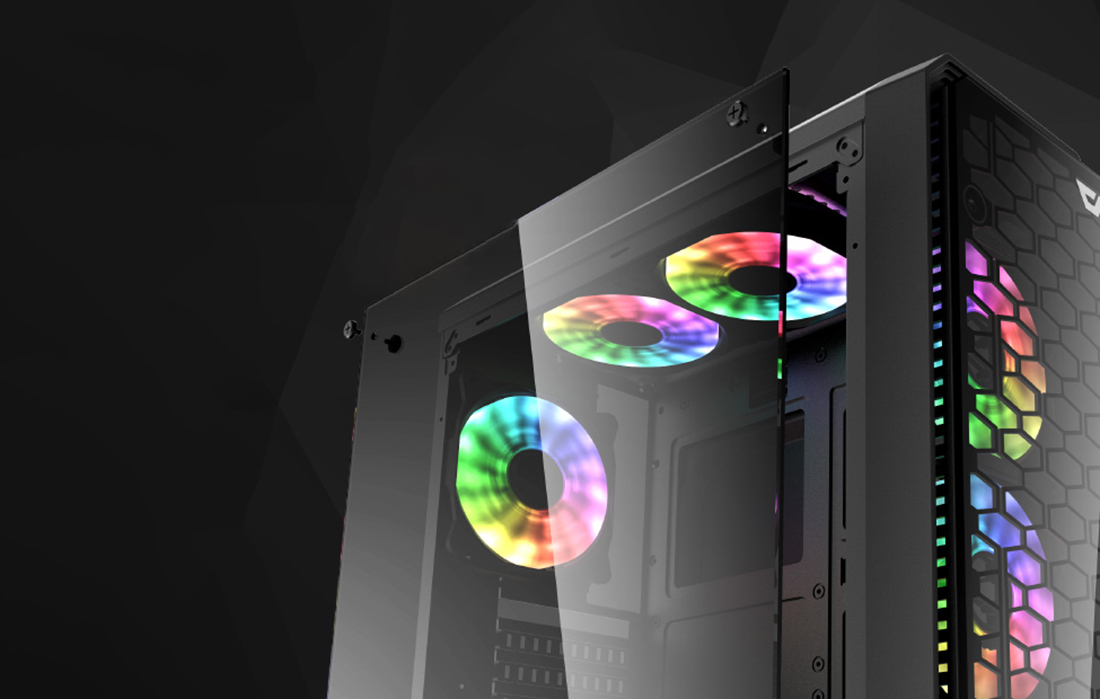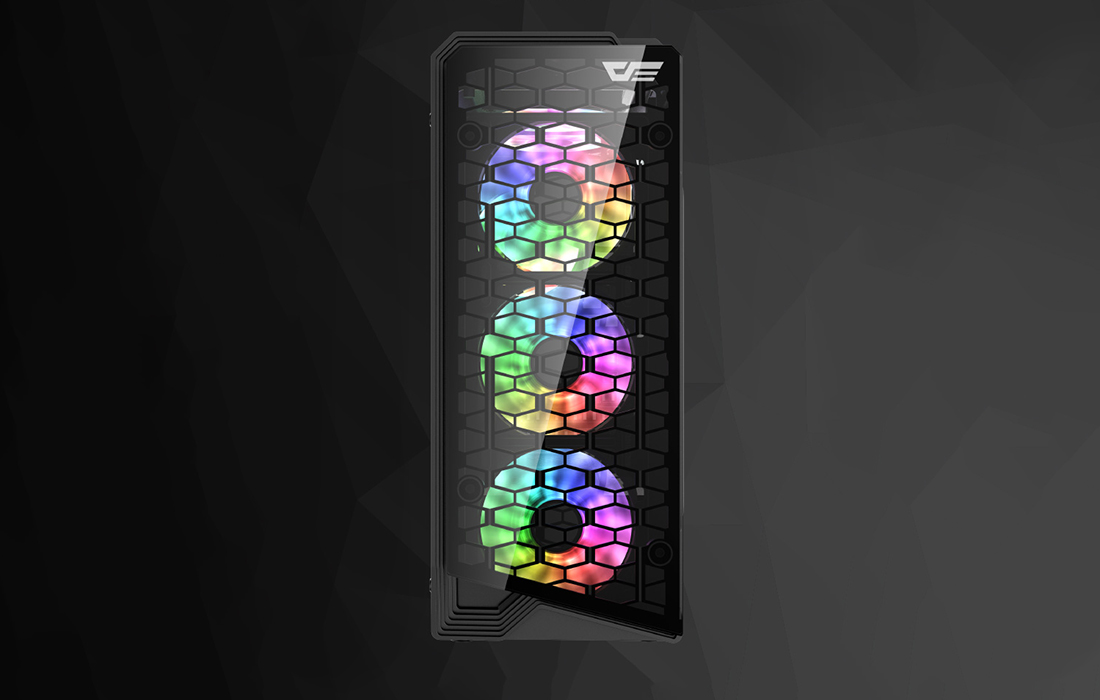 Skříň má skutečně výjimečný vzhled. Přední panel zaujme zajímavým voštinovým vzorem. Přední panel je vyroben z tvrzeného skla, zatímco boční panel je z odolného skla. Přední panel je vyroben z tvrzeného skla, zatímco boční panel je vyroben z odolného 4 mm silného akrylového skla.