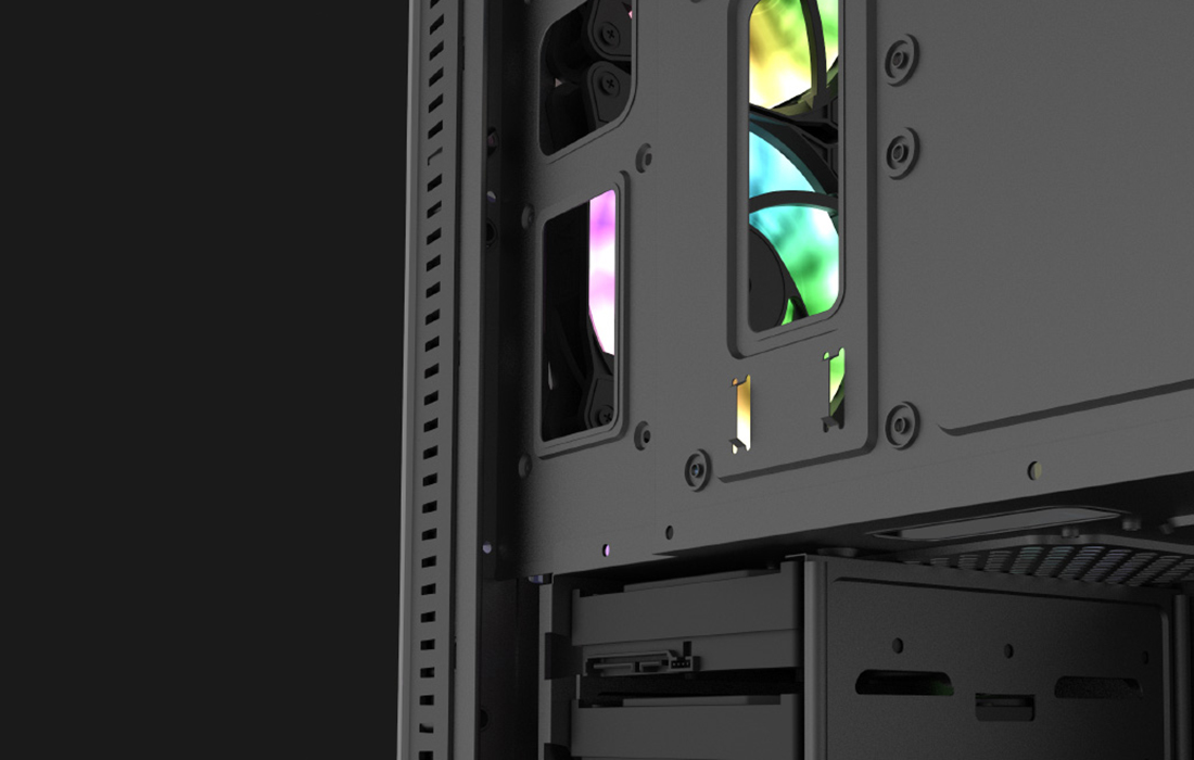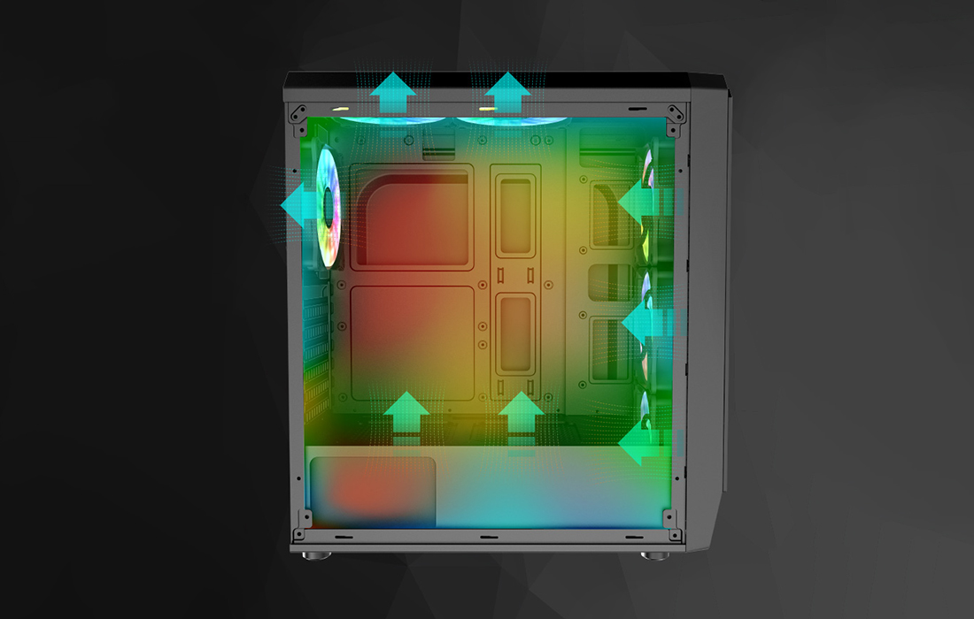 Nemusíte se obávat, že by se váš počítač přehříval. Výrobek pojme až 8 ventilátorů (k dispozici samostatně) a je vybaven vnitřním chladicím kanálem. Získáte možnost instalace vodního chlazení v horní části skříně s 240mm průměrem nebo 2 120mm ventilátory. Na přední stranu můžete umístit vodní chlazení o průměru 360 mm nebo 3 ventilátory o průměru 120 mm. V zadní části skříně najdete prostor pro jeden 120mm ventilátor. Nad napájecí skříní je prostor pro 2 ventilátory, takže můžete dosáhnout účinnějšího chlazení a zajímavého RGB efektu.