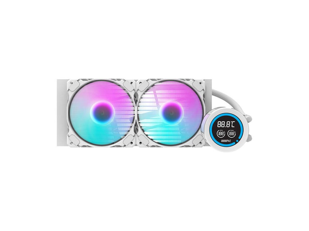 Darkflash DN-D240 je vysoce výkonný 240mm vodní chladič, který zajišťuje stabilní provoz procesoru při nízkých teplotách. Je vybaven měděným vodním blokem a hliníkovým chladičem, které účinně odvádějí teplo, což je nezbytné při vysokém zatížení systému. Dva 120mm ventilátory s hydraulickými ložisky, PWM regulací a ARGB podsvícením zajišťují optimální proudění vzduchu a tichý provoz. Displej LCD umožňuje sledovat teploty CPU a RAM a trubice IIR+EPDM zajišťují vysokou teplotní odolnost a trvanlivost konstrukce.