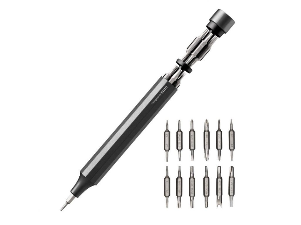Tento praktický šroubovák je ideální pro drobné opravy nebo kutilství. Je vyroben z vysoce kvalitní hliníkové slitiny, je mimořádně odolný a poskytuje vysokou úroveň pohodlí i při dlouhodobém používání. Sada se dodává s 12 oboustrannými bity (24 typů), které můžete uložit do magnetického boxu umístěného uvnitř šroubováku.