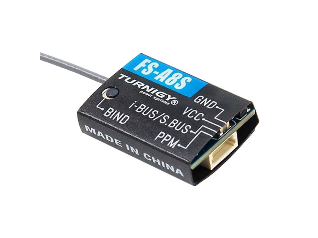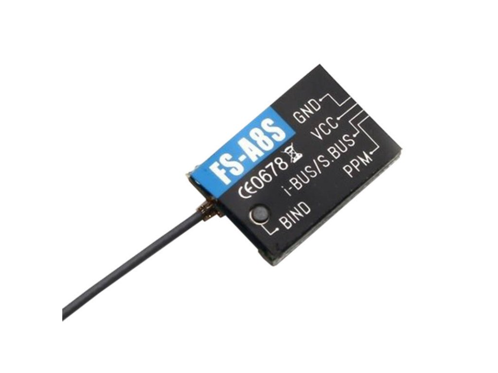 Ve světě FPV dronů jsou hmotnost a velikost komponentů nesmírně důležité. V této oblasti se osvědčil 8kanálový přijímač FS-A8S, který váží pouhých 1,2 g a má rozměry 20 x 14,5 x 3 mm. Jednosměrný přijímač určený pro drony využívá mimořádně stabilní protokol AFHDS 2A a podporuje standardní výstup PPM i i-BUS až do 18 kanálů. Přijímač má dosah až 300 metrů. Přijímač je kompatibilní s vysílači FS-i4, FS-i6, FS-i6S, FS-i6X, FS-i10, FS-GT2E, FS-GT2G, FS-GT2F a také s vysílači Turnigy, například TGY-i6s, Turnigy Evolution.