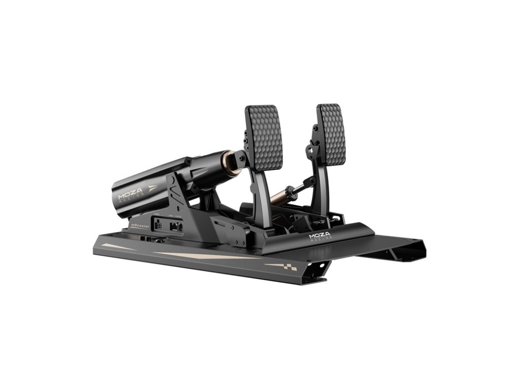 Součástí sady je také aktivní univerzální pedál MOZA mBooster. Je vybaven přesným kuličkovým šroubem a segmentovým servomotorem, který eliminuje provozní tření a zaručuje tichý provoz (44 dB) a plynulý výkon. Je vybaven dvěma snímači, které přesně měří sílu šlapání od 0 do 400 kg, a poskytuje výjimečnou přesnost bez mrtvých zón, což vede k plynulému a citlivému ovládání. Jediným kliknutím můžete měnit funkci pedálu mezi plynem, brzdou a spojkou a plně si tak přizpůsobit zážitek podle svých preferencí. Pedál mBooster je plně kompatibilní se sadou CRP2 a jeho biomimetický, zakřivený tvar zlepšuje aplikaci výkonu a pohodlí.