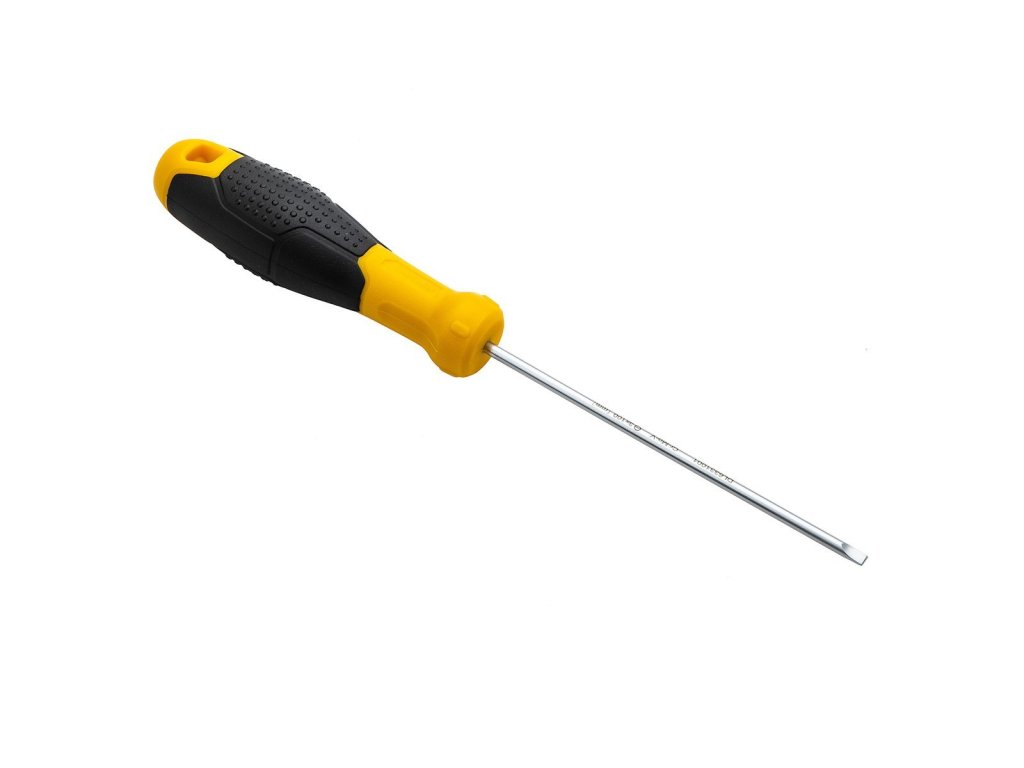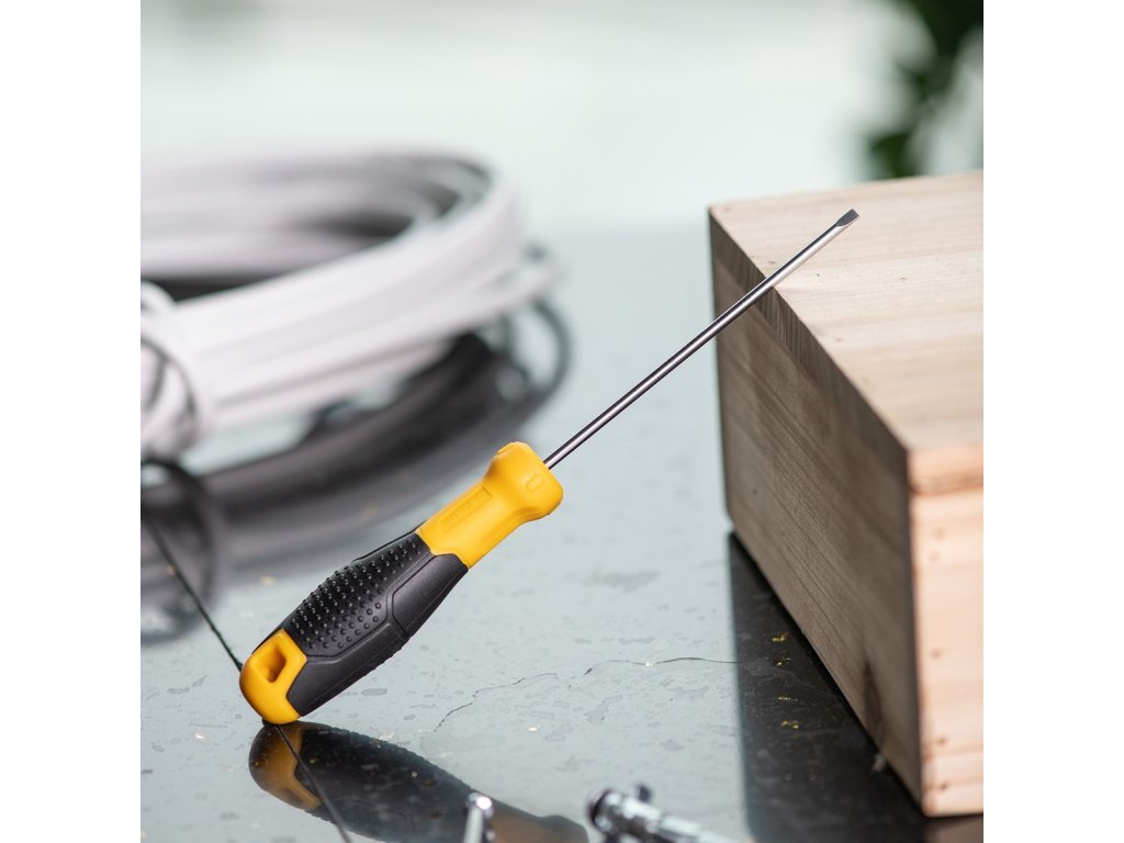 Pohodlně použitelný, robustní plochý šroubovák 3x100 mm ve žluté barvě. Rukojeť výrobku je vyrobena z vysoce kvalitního plastu. Je vybavena praktickým otvorem, který umožňuje zavěšení nástroje například na nástěnku. Šroubovák je také vybaven magnetickým hrotem, který vám výrazně usnadní práci.