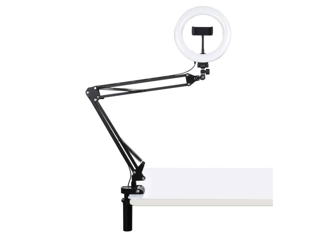 Na držák můžete připevnit kroužkovou LED lampu a pomocí klipu ji připevnit ke stolu. Hlavu držáku lze otáčet o 360° a nastavit podle vašich potřeb. Klip na telefon je kompatibilní s telefony o šířce 6 až 8,5 cm. Díky lehké a přenosné konstrukci se stativ pohodlně používá a přenáší. Vezměte si jej s sebou například na výlety nebo na fotografování v přírodě.
