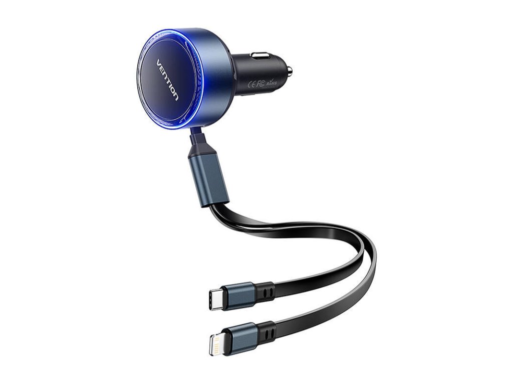 Nabíječka Vention je univerzální řešení pro rychlé nabíjení tří zařízení současně, ideální pro automobily s napětím 12-24 V. Díky vestavěným kabelům USB-C a Lightning a dalšímu portu USB-C poskytuje velkou všestrannost a odstraňuje nepořádek způsobený zamotanými kabely.
